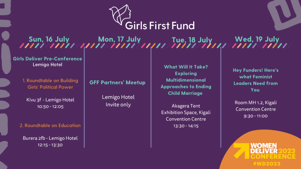 The Girls First Fund (GFF) is supporting a 14-member delegation of team members and grantee partners to attend the Women Deliver Conference 2023, in Kigali, Rwanda from 17 to 20 July 2023.The Women Deliver Conference is one of the largest multi-sectoral convenings to advance gender equality. It is co-created by grassroots advocates, multilateral governments, the private sector, philanthropies, and youth.
